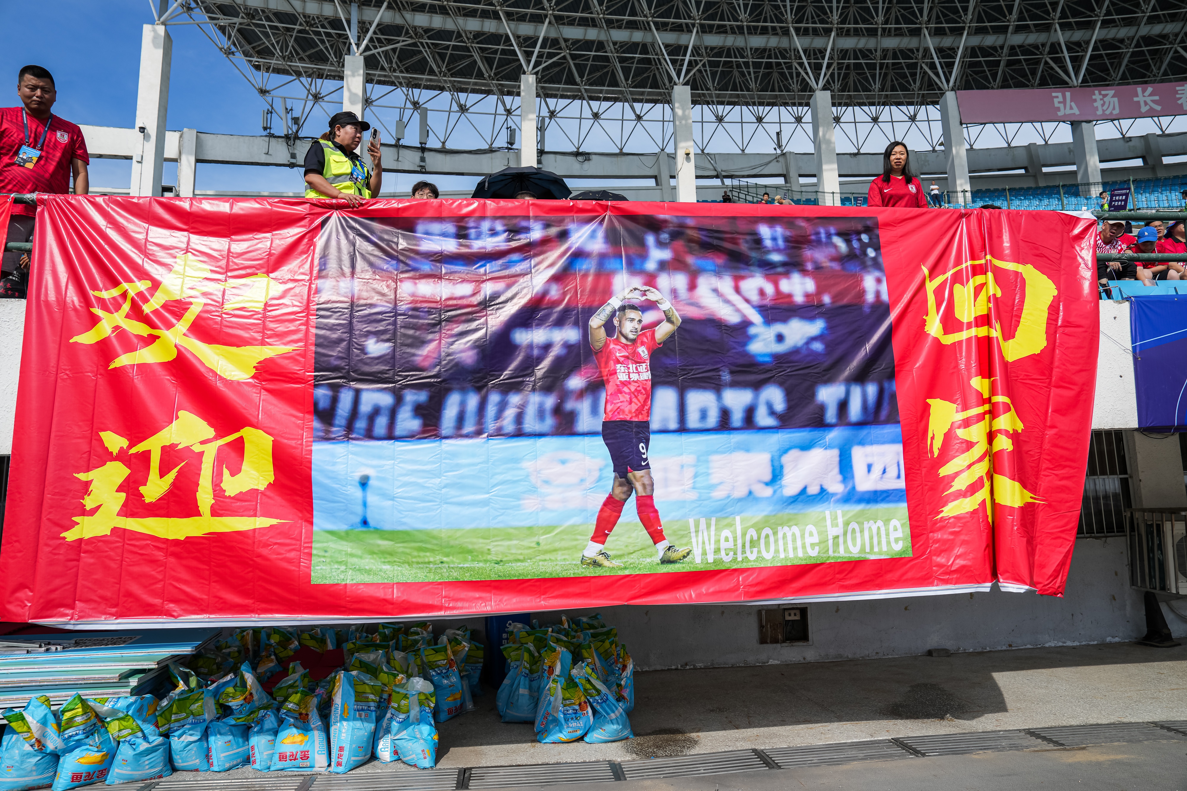 今天长春体育中心体育场的看台上一抹红色为故人绽放,横幅上莱昂纳多的照片和“欢迎回家”四个大字,是长春亚泰球迷在以最炽热的方式拥抱旧将。