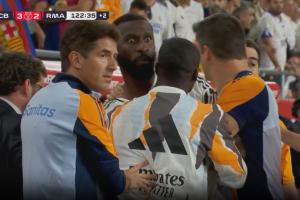 体育资讯04月27日讯 国王杯决赛,巴萨3-2绝杀皇马,皇马三人吕迪格、巴斯克斯、贝林厄姆染红。